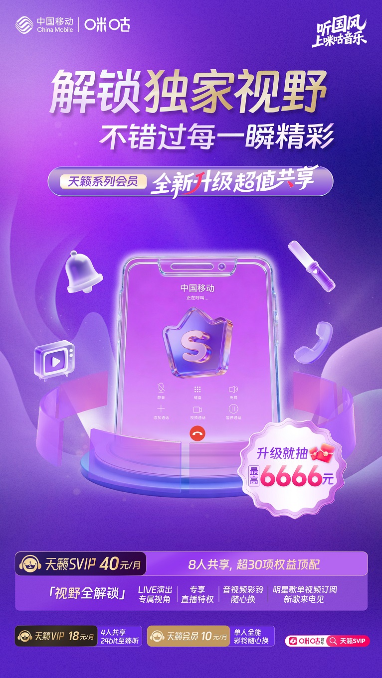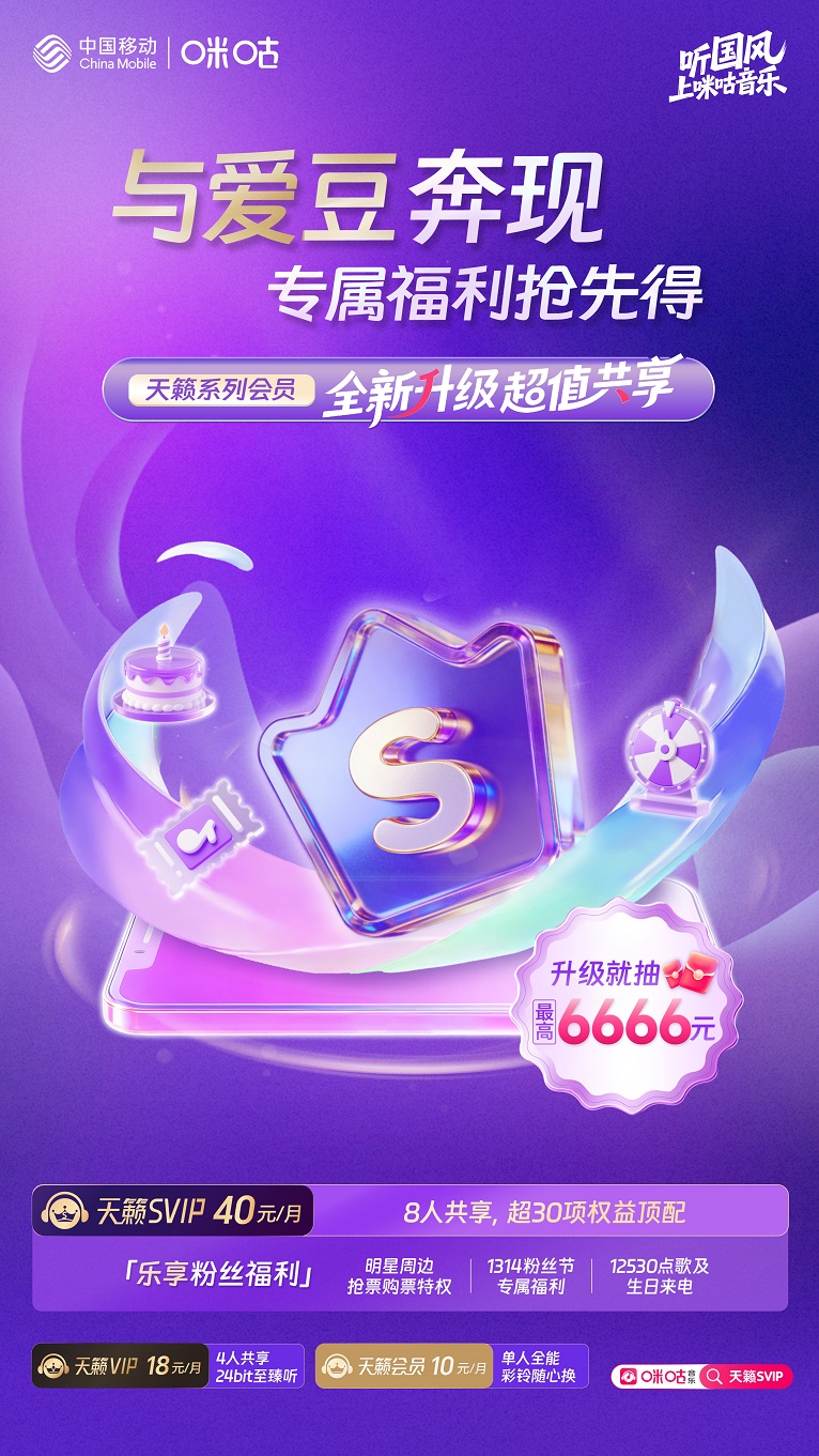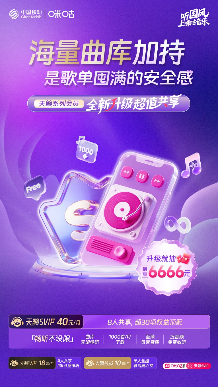 超值升级五:春日宠粉加码 开卡抽 6666 元红包 天籁 SVIP 焕新升级宠粉福利再升级!活动期间,用户开通任意天籁 SVIP 套餐,邀请亲友共享权益等任务,即可获得对应次数的「春日好运池」抽奖机会。开通时长越长,抽奖次数越多,中奖概率越高!邀请亲友共享 SVIP 权益,双方还能解锁额外抽奖机会,福利加码机会翻倍,参与抽奖最高可得 6666 元红包,好运与福利双丰收! 超值升级六:全能焕新定位 一站式承包音乐生活 天籁SVIP还坐拥至臻母带音质、每月 1000 首歌曲下载、每月 2 张付费数字专辑兑换、1314 粉丝节额外抽奖机会等福利,真正实现听歌、追星、共享、互动、领福利全场景全覆盖,一卡解锁全能音乐生活,打造音乐会员新标杆! 锁定咪咕音乐,沉浸式打卡周董全量经典!天籁 SVIP 焕新限时尝鲜,春日宠粉福利拉满,开通任意套餐,喊上亲友共享会员权益,即可参与抽奖,最高赢 6666 元大奖!