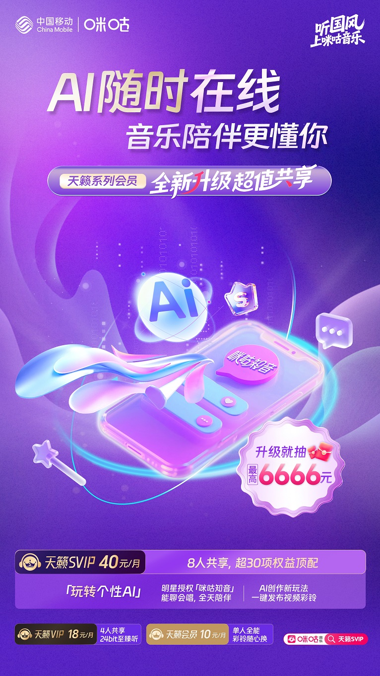 超值升级四:AI 陪伴 + 追星特权 旗舰福利全拉满 天籁 SVIP 全能旗舰会员一键解锁全等级 AI 权益,咪咕知音24小时在线宠粉,它能记住你的音乐喜好,深夜解闷、通勤无聊随时回应,听歌不孤单,心事有回音,专属陪伴超贴心。 粉丝节专属特权开启,专属通道提前抢线下活动门票,告别手速焦虑,更有专属场次免费抢票、每月1314 粉丝节额外抽奖机会,超多爱豆周边好礼等你来,轻松拉近与爱豆的距离!