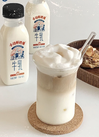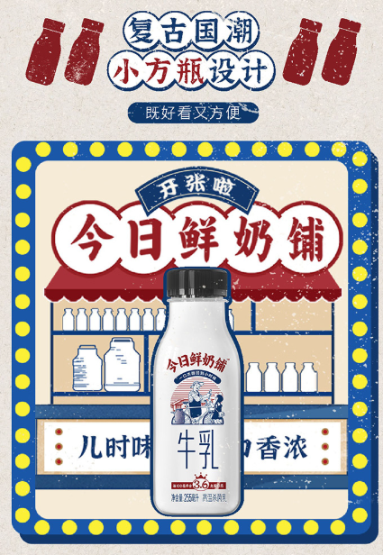 “今日鲜奶铺”采用复古小方瓶设计,白色瓶身搭配经典红蓝国潮图案,既复刻了“送奶师傅推着三八式自行车吆喝”的儿时记忆,又兼具便携性——255毫升容量适配单手握持,冷藏后饮用更显香浓,成为年轻人“打卡春日鲜生活”的新宠。