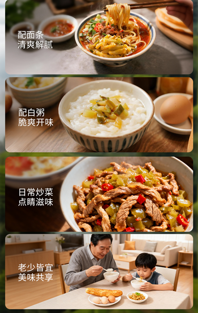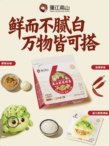 在2025年重庆市食品及农产品加工高质量发展产业生态大会上,蓬江高山鲜养·富硒低盐榨菜凭借富硒、减盐、含益生元、短保质期等卖点受到客商广泛关注。 03 口碑传播的底层逻辑:真实体验的价值共振 消费者自发推荐蓬江高山,源于五个口味的差异化体验。 清爽味:保留了青菜头本真的清甜回甘,适合日常佐餐或空口零食; 葱香味:带有温润的油脂气息,能让寡淡的白粥瞬间有“家的温度”; 微辣味:辣感温和,适合需要提神的日常; 火锅味:复刻川渝红汤的复合香气,让一包榨菜成为“浓缩锅底”; 魔鬼辣味:留给追求极致体验的消费者。