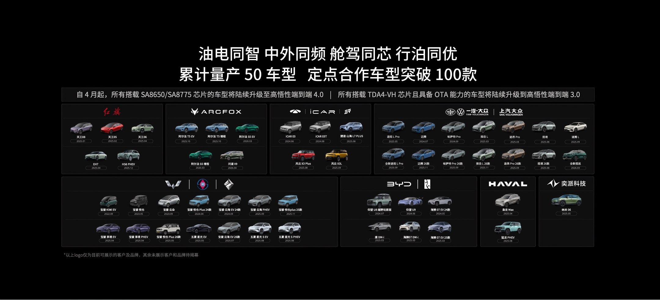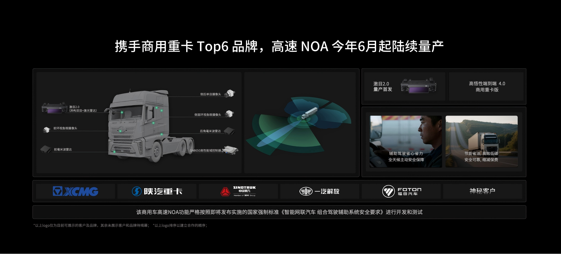 已有版图:五域齐发,验证跨垂类迁移能力 任何生态的吸引力,首先来自自身实力。在乘用车领域,卓驭量产车型已超50款,定点突破100款,以“油电同智、中外同频、舱驾同芯、行泊同优”的策略覆盖最广泛的动力形式和品牌矩阵。高悟性端到端4.0将于4月起OTA推送,业内首款量产的8775单芯片舱驾一体方案也已持续交付。 但真正的差异化在乘用车之外。商用重卡方面,卓驭已与中国TOP6商用车品牌合作,6月起陆续量产,控制器与端到端4.0系统与乘用车同源,首发激目2.0舱内变焦方案;客车方面,联合宇通客车的NOA方案9月量产,搭载比4.0更先进的原生多模态基础模型;Robotaxi赛道,基于双Thor芯片的三冗余L4控制器已就绪,下半年开启试运营;无人物流车领域,全链路城配方案7月试运营,展台同步展示了实车。