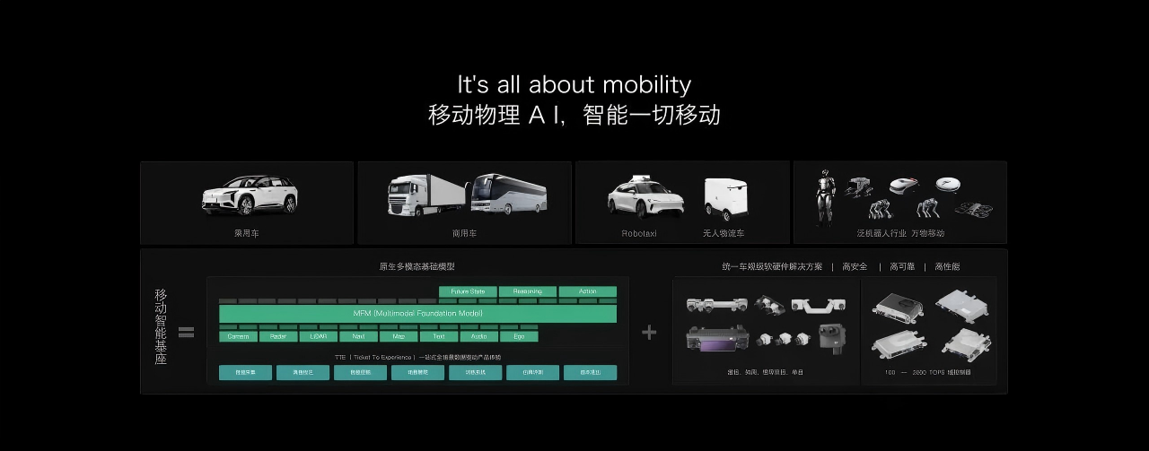 结语 三场签约,分别锚定了算力底座、场景纵深与全球化路网。将它们与卓驭五大移动领域的规模化成就叠加审视,完整的移动物理AI生态版图已然浮现:一套原生多模态基础模型,既能在高速干道上为重卡护航,也能在城市街头为Robotaxi引路,还能在社区小巷为无人物流车穿行,且无需为每个场景、每个国家重新建模。 这正是从“移动智能基座”到“智能一切移动”的逻辑闭环——以技术突破为圆心,以开放生态为半径,与产业链最优秀的伙伴一起,将万物移动的时代从蓝图拉入现实。 It's all about mobility.