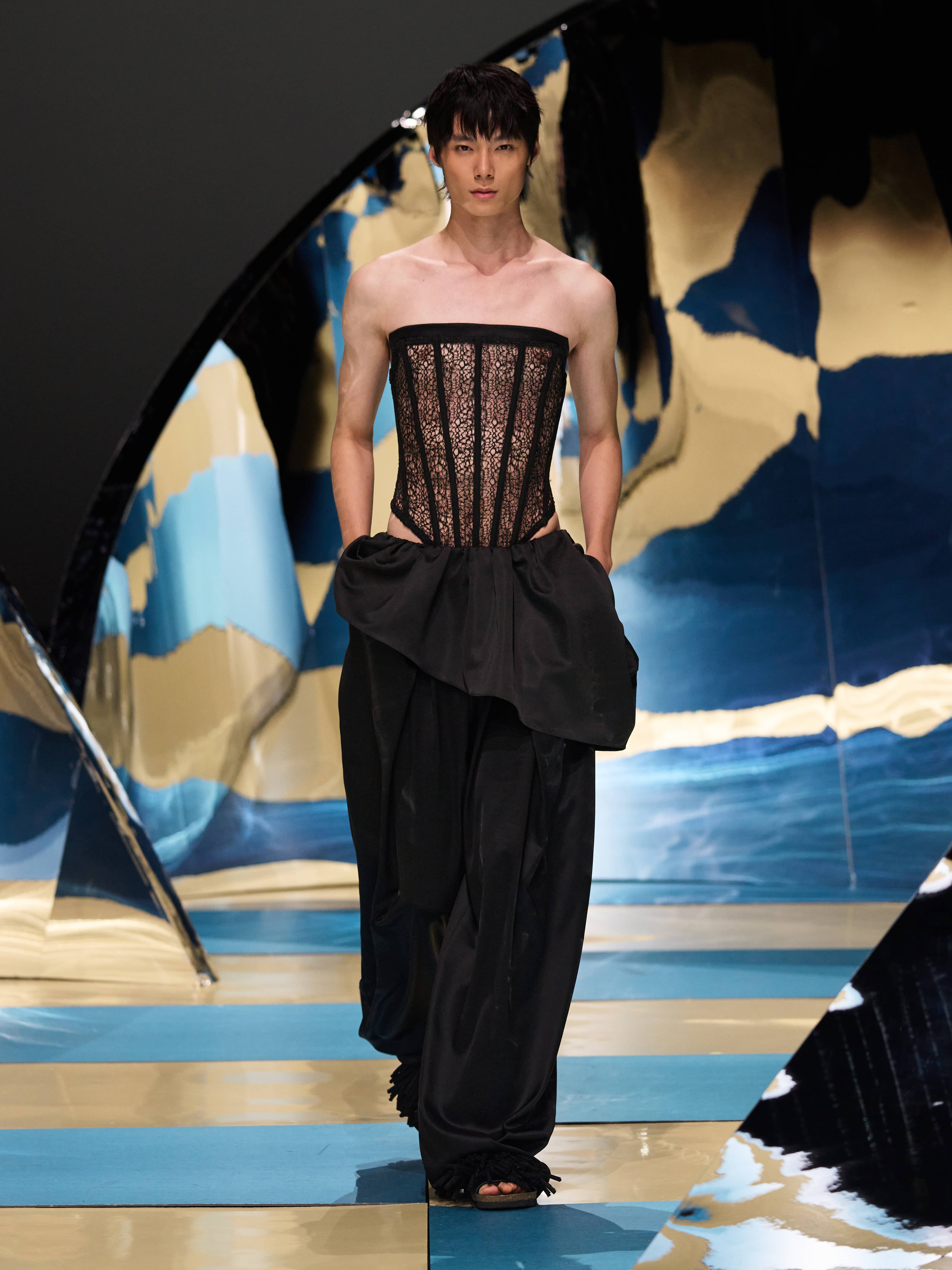 秀场中心特制金属弧形装置,以新月、满月、残月三相形态交错融合,高反射镜面材质通过凹凸变幻隐喻月相循环。棋盘格地面延伸出无限视觉,模糊真实与倒影的边界,强化了“轮回”与“无限”的概念。