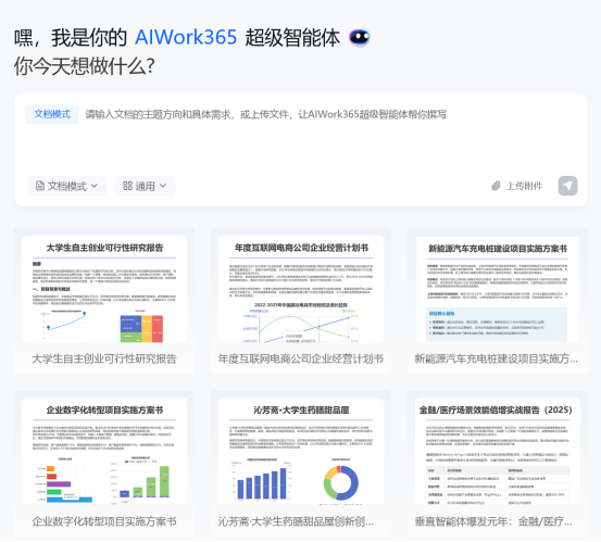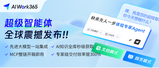 超级智能体:办公领域的“超级飞跃” AIWork365 超级智能体的上线,绝非一次简单的迭代升级,而是一场面向未来办公的“超级智能化”飞跃。它集结了全球先进大模型,拥有众多令人惊叹的能力。 文档与网页一键生成,让创作变得轻而易举;MCP 整链“开箱即用”,实现全流程丝滑创作;AI 知识全库触手可及,关键信息秒级获取;专家级标准硬核交付,全场景精确执行、极限性能保障。从今天起,它不再仅仅是一个工具,更是你最得力的智能合作伙伴,助力你轻松拥有办公效率的“霸屏时刻”。 直击痛点:终结职场人的“噩梦” 职场人常常陷入这样的困境:60%的时间都耗费在写不完的报告、改不完的方案里。从计划书的框架搭建,到方案书的细节打磨,再到报告的数据调研,每一项任务都耗时长、门槛高,熬夜改稿成了家常便饭,却无暇顾及真正有价值的工作。 AIWork365 超级智能体的出现,彻底终结了这些痛点。它构建了“3 个专家智能体 + 1 个通用智能体”的垂直专业系统,精准击中办公核心需求。在文档模式下,你可以上传现有文档作为参考或素材,“超级智能体”可在文档内进行智能续写、改写、总结、翻译等操作,实现深度交互和精细打磨,所见即所得,编辑更高效。