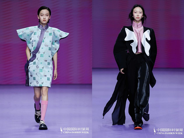 Beautyberrykids 方琳、王琳恩 具象的喜字设计用不同的装饰手法呈现别具一格的鲜明个性,色彩运用别致,在低饱和度中融入矿石水晶色,冲撞中创造视觉和谐之美。服装结构借鉴民国时期的中式剪裁,结合当下人体特征与大廓形风貌,创造身体与服装的空间感,张弛有度,用粗旷的线条勾勒细腻身型,呈现不拘一格中装风貌的时髦轮廓。传统手工技艺中“镶·嵌·滚·烫”在服装工艺细节中充分运用,多层次结构搭配设计让穿着造型更显摩登俏皮。
