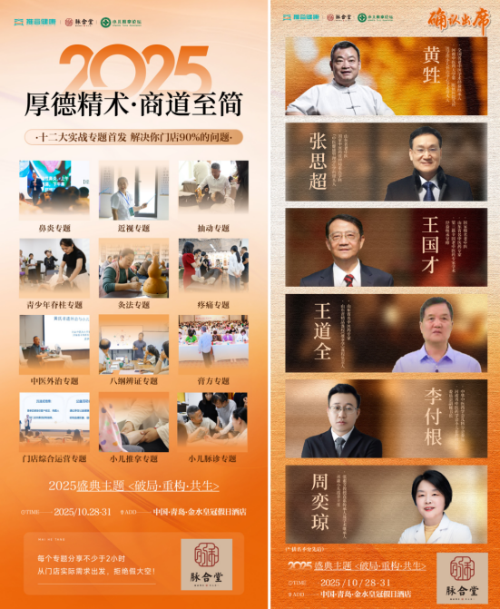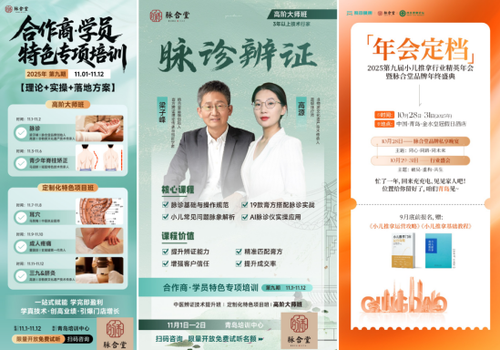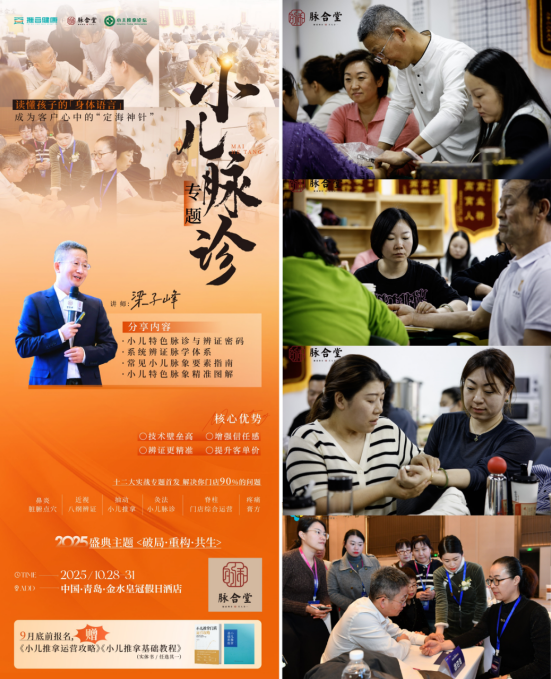 ☞ 2025第九届小儿推拿行业精英年会暨脉合堂品牌年终盛典 主题:破局·重构·共生 时间:2025年10月28日-31日(10月28日晚为脉合堂品牌私享晚宴) 地点:中国·青岛金水皇冠假日酒店 ☆ 十二大重磅专题: 鼻炎丨近视丨抽动丨灸法丨膏方丨中医外治丨八纲辨证 疼痛丨青少年脊柱丨门店综合运营丨小儿推拿丨小儿脉诊 技术精进的路上,最怕错过与高手的思维碰撞。 这一次,让梁子峰老师带你深入脉学秘境,让每一次指尖的轻触,都充满洞察与信心。 想了解更多课程详情或报名,可通过以下渠道咨询: 视频号:@脉合堂品牌管理、@老徐的四海五湖 - 大健康 公众号:@脉合堂品牌 期待在青岛,与你一起,以指为媒,探脉求真 【近期脉诊课程安排】 · 10.28-10.31 第九届小儿推拿行业精英年会暨脉合堂品牌年终盛典 《临证脉学进阶:小儿脉象鉴别与精细化操作指要》 · 11.01-11.02 合作商 · 学员特色专项培训 《小儿特色脉诊-大师班》 想了解更多课程详情或报名,可通过以下渠道咨询: 视频号:@脉合堂品牌管理、@老徐的四海五湖 - 大健康 公众号:@脉合堂品牌 小班教学,名额有限,适合渴望突破技术瓶颈的推拿师。