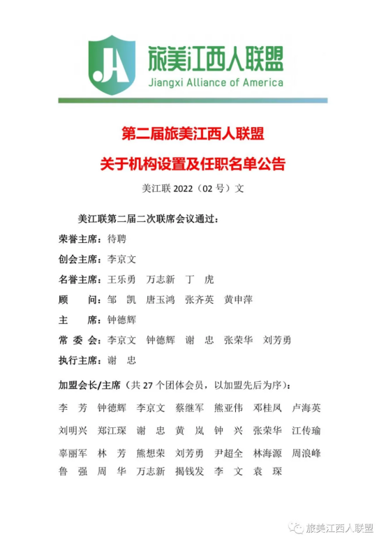 钟德辉在美江联第二届二次会议上宣布机构设置及拟任职人员名单|旅美江西人联盟