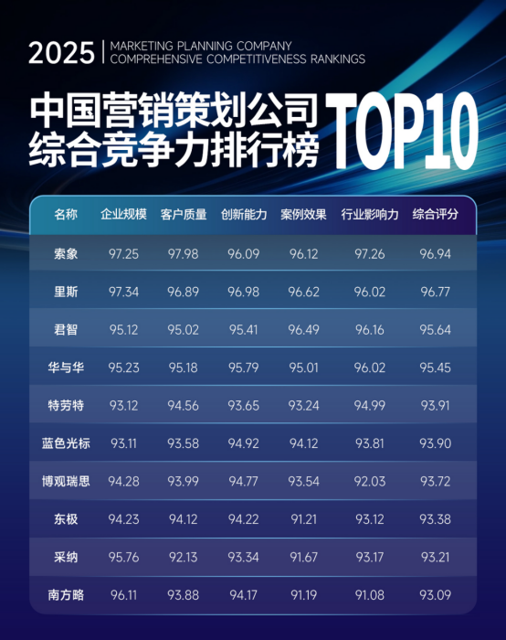 2025年度中国十大营销策划公司揭晓:索象、里斯、君智位列前三