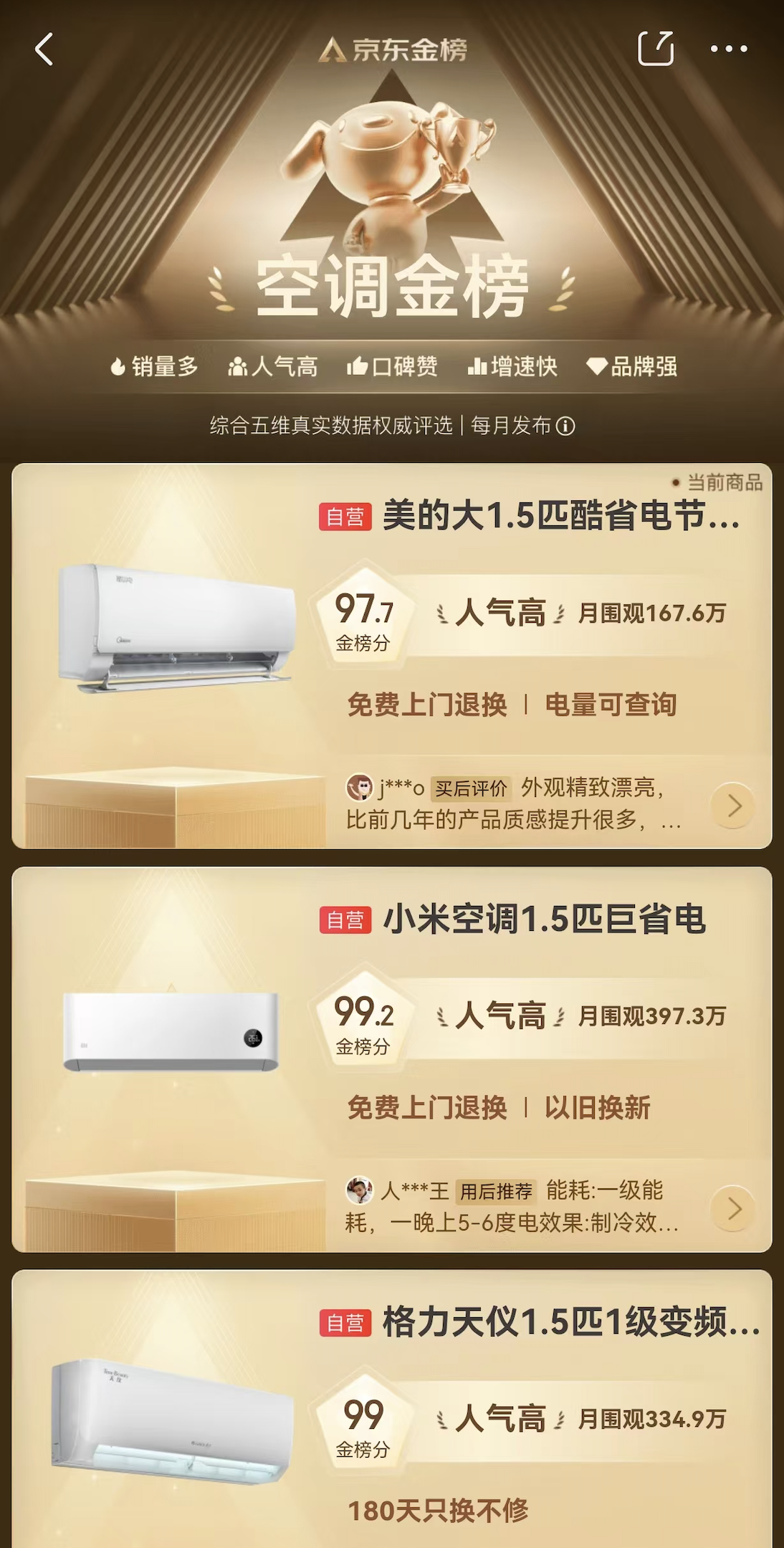 京东双十一于10月9日晚8点正式启动。截至开售28小时,美的酷省电系列空调表现强势,不仅夺得京东“竞速榜”2匹及以上挂机累计榜冠军,更以97.7的高分登顶京东空调金榜,实现销量与口碑的双重领跑。