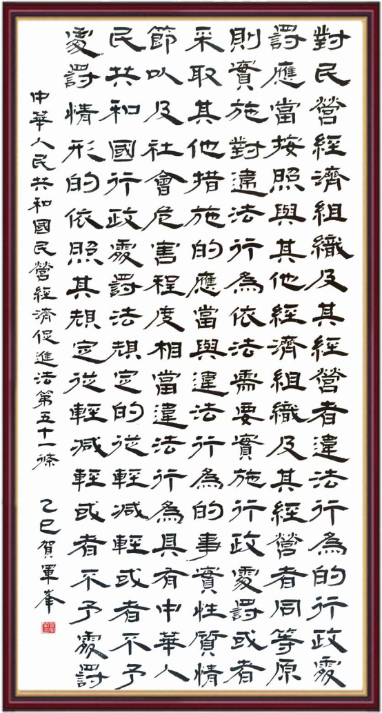 当书法遇上法律,会擦出怎样的火花? 《中华人民共和国民营经济促进法》自今年5月20日起施行。作为我国首部专门关于民营经济发展的基础性法律,民营经济促进法将支持和保障民营经济发展的法律制度融入中国特色社会主义法律体系,具有重大的法治意义,为促进民营经济持续、健康、高质量发展提供了坚实的法治保障。为更好地学习、宣传、贯彻这部法律,法治日报社联合司法部普法与依法治理局,开展“‘书·法’系列活动之书写《中华人民共和国民营经济促进法》”活动。 2020年7月11日,由法治日报社主办、法报文化传媒(北京)有限公司和北京千音文化传媒有限公司联合承办的“书·法”系列活动正式启动。“书·法”活动旨在为创新法治宣传教育,多开一点脑洞、多花一点心思、多出一点力量、多作一点贡献,引领和推动更多的人拿起笔来学法、写法,在不断“书·法”过程中,提升自身的法治素养,在全社会弘扬法治精神。先后书写《中华人民共和国民法典》《中华人民共和国宪法》《中华人民共和国澳门特别行政区基本法》《中华人民共和国香港特别行政区基本法》《中华人民共和国国旗法》《中华人民共和国国徽法》《中华人民共和国国歌法》《中华人民共和国法官法》《中华人民共和国黄河保护法》等19部法律法规。 精彩内容,敬请关注。