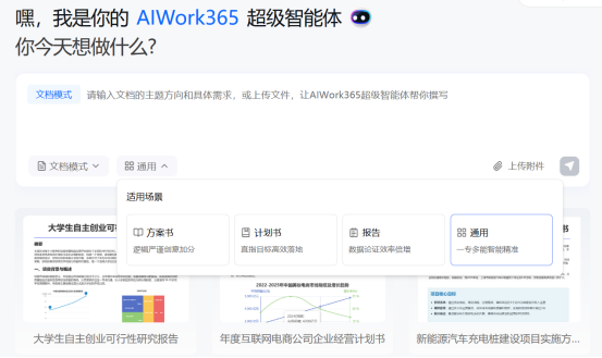 近期,集成了大模型能力的智能办公平台逐渐崭露头角。以AIWork365超级智能体为例,其构建的“3个专家智能体(方案书、计划书、报告)+1个通用智能体”体系,直指职场中最耗时的文档创作痛点,提供垂直领域的专业级解决方案。