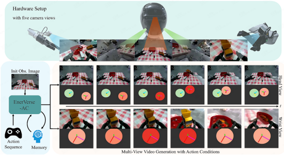 近日,智元机器人发布具身智能领域两大突破性成果——全球首个基于机器人动作序列驱动的具身世界模型EVAC(EnerVerse-AC),以及业内首个具身世界模型评测基准EWMBench,二者已全面开源,旨在构建“低成本模拟-标准化评测-高效迭代”的全新开发范式,为全球具身智能研究提供核心支撑。 EVAC通过多级动作条件注入机制,实现“物理动作-视觉动态” 端到端生成,具备机器人动作与像素高精度对齐、动态多视图建模、长时序一致性输出及数据高效利用四大核心能力,且基于少量专家轨迹实现大规模数据增广,使策略模型任务成功率提升29%。