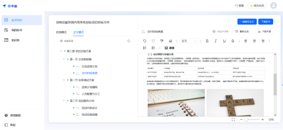 智能生成,专业适配 基于招标要求,10分钟生成完整投标方案 覆盖100+细分行业,专业术语精准匹配 结构化输出,直接形成投标文件框架