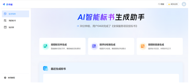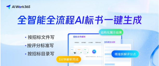 2、语言专业润色,提升中标说服力 担心文笔不够专业、表达不够有力?系统可将口语化或平淡的表述,自动优化为严谨、规范、具竞争力的投标语言,增强方案可信度与专业形象,让标书在评审中脱颖而出。 3、智能查漏补缺,规避废标风险 AIWork365易中标具备“智能审查”能力,可自动比对标书与招标要求,检查关键条款响应情况、必备资质是否齐全、格式是否合规,如同一位资深标书顾问,帮你有效排除低级失误,保障标书合规性与完整性。 【AI写标书的三大核心优势】 ✅ 极速高效,释放人力 将数周工作量压缩至几天甚至分钟级,让你有更多精力聚焦于业务策略与客户沟通。 ✅ 降低门槛,轻松上手 无论是否有投标经验,都能通过系统引导快速掌握标书产出,显著降低企业培训与用人成本,让小白也能够参与到投标工作中来。 ✅ 质量可控,提高中标几率 AI生成内容结构清晰、逻辑严密,配合智能审查机制,标书整体质量远超手工撰写水平,有效提升中标概率。 【新手用户 · 轻松三步出标书】 1、上AIWork365易中标,开启标书制作 支持“按招标文件生成”、“按评分标准生成”、“按招标目录生成”等多种模式,灵活适配不同招标需求。