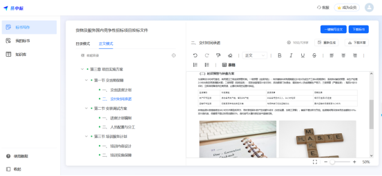 另外,系统还支持:同义改写:避免重复表述。字数伸缩:一键压缩或扩展内容,满足不同招标对篇幅的要求。
