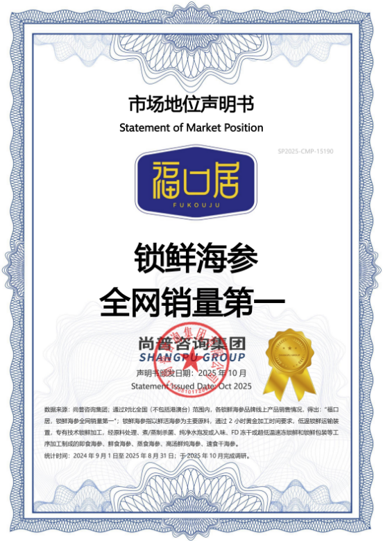 2025年10月21日,福口居获得尚普咨询“锁鲜海参全网销量第一”认证,成为行业与消费者共同瞩目的焦点。这张证书不仅是销量层面的领先证明,更是对福口居产品理念与行业贡献的高度肯定,标志着即食海参正式进入“品质驱动”的新周期。