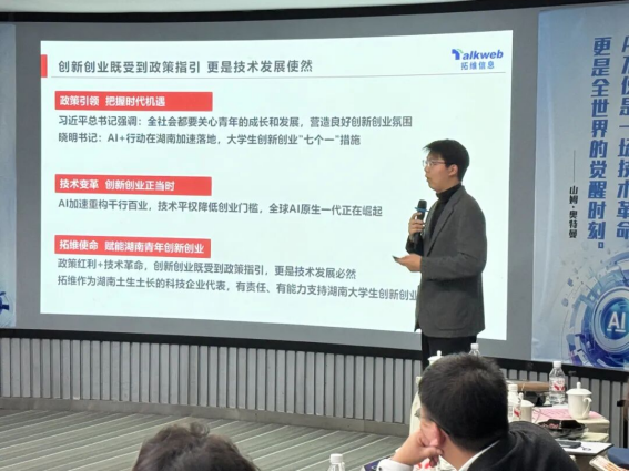 图/拓维海云天高校产品总监崔文 从高校课程考核到产学研用合作,拓维信息始终致力于推动教育创新与产业需求的深度融合。拓维信息湖南公司副总经理黄登峰在会上为到场嘉宾全面介绍了Talkweb House科创孵化平台。作为对标国际先进模式打造的科创孵化平台,Talkweb House将会为人才实习实训、产学研用等全方位合作提供一个线上线下一体化科创平台。