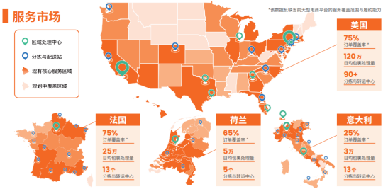 一系列硬核数据印证其强大的物流实力:日处理150万+包裹的效率可从容应对促销高峰,2天平均妥投时间、95%准时送达率与99.5%成功送达率的“三高标准”,远超行业平均水平。洛杉矶、纽约等核心枢纽每小时数万件的分拣效率,搭配Geek +智能机器人与动态路径优化技术,构成了包裹快速流转的“加速器”。