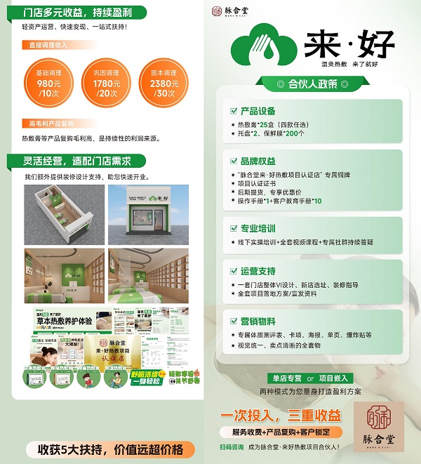 若你想打造专业热敷品牌店单店专营专注 “来好热敷” 项目,快速树立专业形象,还能获得全套装修VI设计、选址指导,省心开业;