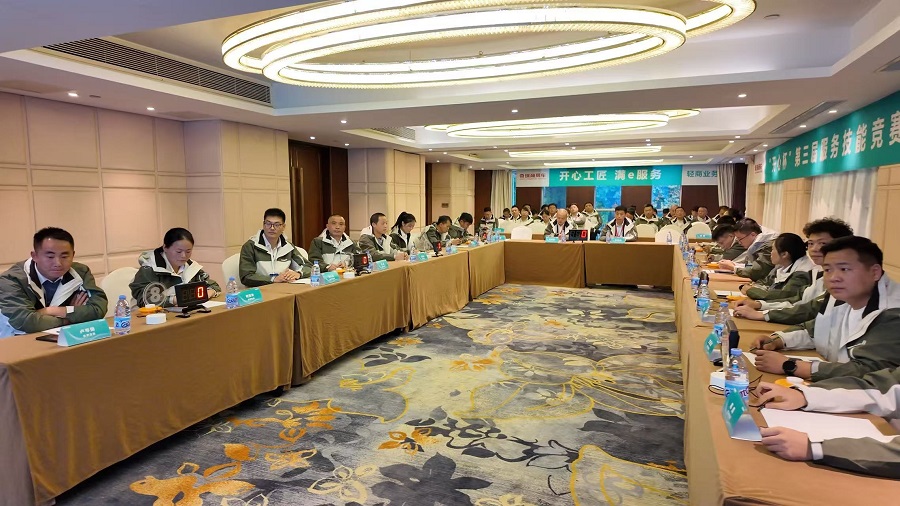 选手及嘉宾合影 · 脑力实力的巅峰对决 “工匠精神”的生动诠释 极致的服务,是一场看不到硝烟的“战争”,是对脑力与实力的极致考验。 本届“开心杯”决赛,赛场如战场,比赛设置理论环节、抢答环节和实操环节,服务顾问重点考倾听客户的声音,内容涉及服务流程、专业话术、三包知识、客户满意如何提升如何落地执行;维修技师侧重三电知识、维修诊断、远程诊断、案例分析等。他/她们在规定时间内凭借扎实的基础理论知识、高效完成一系列服务及技术分析案例,进而呈现一份份完美的答卷。 巅峰脑力对决,挑战参赛选手的知识储备与极速反应能力,每一位选手,都是“工匠精神”的生动诠释者。他们比拼的不仅是专业上的速度与准确度,更是对现场反应力、知识力与心理力的综合考验,为锻造更高水平、更具韧性的服务团队打下夯实的基础。