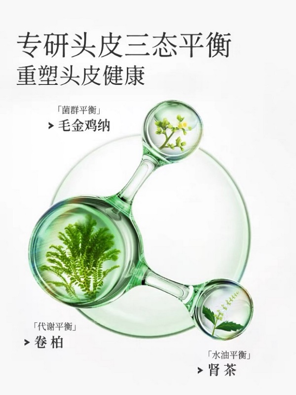 2.三态平衡与双柏防脱因子的完美结合 专研头皮三态平衡,重塑头皮健康 舒霖品牌秉持"防脱长期主义"理念,创新性地提出头皮生态养护的重要性。传统防脱思路往往只聚焦于抑制脱发因子,而忽视了头皮作为头发生长"土壤"的健康状况。舒霖通过"双柏防脱因子"与"三态平衡"养护理念的双重作用,提供了一套从微生态到毛囊活化的完整解决方案。 舒霖从云南雨林植物宝库中精准筛选三种珍稀植萃,通过独创科学复配工艺,三大植萃活性成分产生显著协同增效,形成舒霖全球首创的核心科技——“三态平衡因子”,并全线应用于品牌产品矩阵。三态平衡因子如同“头皮生态养护师”,协同作用于三大平衡维度,从源头阻击头皮问题,根源恢复头皮健康。 三态平衡理念从三大维度重塑头皮健康: 肾茶:调节皮脂腺,从源头实现水油平衡,解决“外油内干”。 毛金鸡纳:抑制有害菌(如马拉色菌),呵护有益菌,重建健康菌群屏障。 卷柏:促进角质代谢,加速微循环,优化细胞代谢与废物清除能力。
