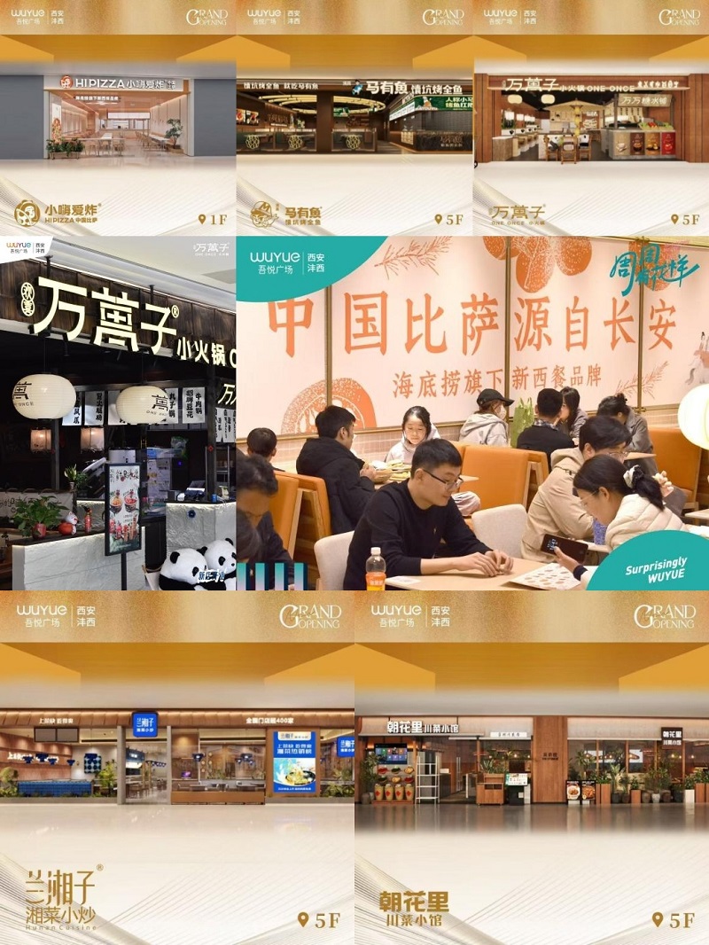 作为沣西新城核心商业地标,沣西吾悦广场已成功汇聚华为智能生活馆、星轶影城、美天惠超市、我命由我陕西菜等多家主力店和次主力店,形成覆盖全客层的一站式生活中心。十一月,广场品牌矩阵再度实现重要升级: 在新店开业方面,广场引进了多个备受年轻消费者喜爱的品牌。炸鸡品牌「小嗨爱炸」以其独特的口味配方和时尚的店铺设计,为快餐市场注入新活力;特色餐饮「马有鱼」则主打新鲜美味的鱼类菜品,为食客带来全新的味觉体验;本土风味品牌「欢喜万万子」则深耕陕西地方特色小吃,以现代手法演绎传统美食,受到本地消费者的热烈欢迎。