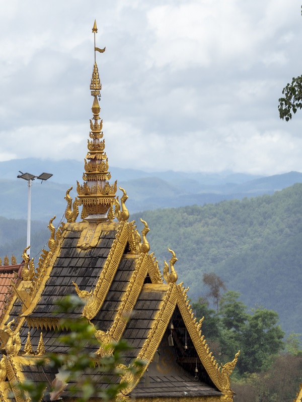 这里的建筑有着独特的语言。干栏式的木楼层层叠叠,而寺庙的金色塔尖则在阴云与青山的映衬下显得格外耀眼。这种金与黛的配色,是景迈山特有的庄重。远处的山峦在云雾中若隐若现,风吹过塔顶的风铃,发出的清脆声响,似乎能瞬间抚平旅途的躁动。