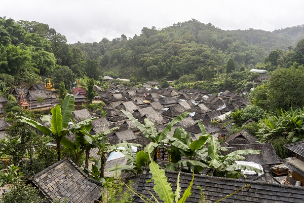 站在高处俯瞰,整座古寨宛如从森林中生长出来一般。灰黑色的瓦顶像鱼鳞般铺陈开来,芭蕉叶点缀其间,这是人与自然最和谐的共生。
