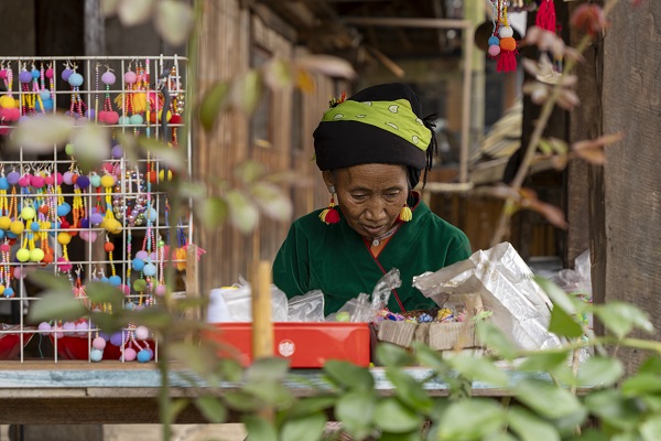 在翁基古寨或糯干古寨的街角,你总能偶遇正在做手工的老奶奶。她不需要招揽生意,只是专注地摆弄着手中的彩线和饰品。那些色彩斑斓的挂件,不是工业流水线上的商品,而是指尖的温度和民族的记忆。