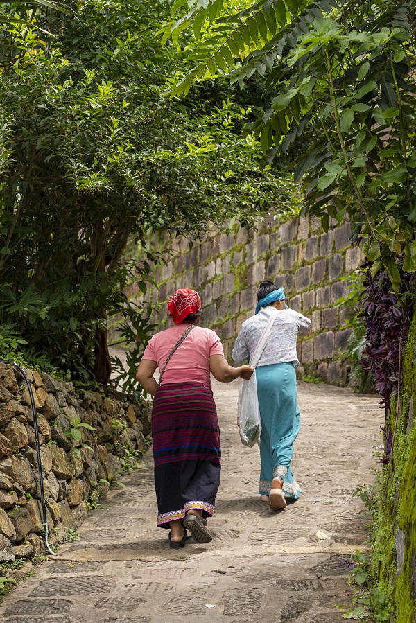 这里的慢,还体现在细节里。路边闲坐的阿婆们,穿着鲜艳的民族服饰,聊着家常。