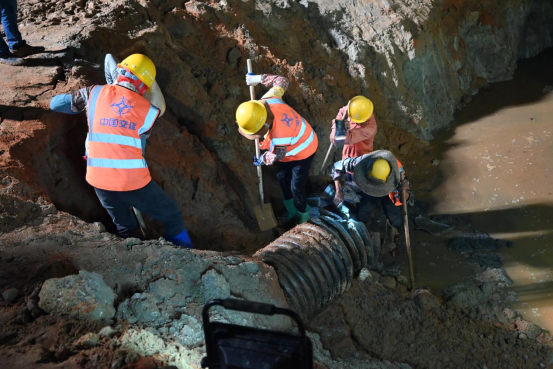 险情现场,涌水已把沙滩冲刷成一个水洼,中央部位逐渐凹陷,周围泥沙发生偏移,且有愈演愈烈之势。 险情原因是沿海岸线的滨海大道雨水排水管使用时间较长,加之连续一周的降雨使部分管节破损渗漏。经过现场紧急会商,刘书骏建议打开内外海闸阀,降低险情区域海平面标高,同时排查上游管井,按管道尺寸实施封堵,最大限度减少下游出水量,随后找到渗漏处替换连接新管道。方案得到政府部门及业主的认可。 由于无法掌握地下管节铺排的精确位置、管节型号和数量,快速找到渗漏位置更换管节便好似“盲人摸象”。时间不等人,刘书骏一边联系项目现场管理工程师鲍彤抽调人员及挖机,一边联系物资管理员孙青卿调拨多种管件等材料。