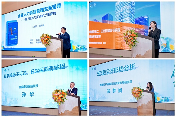 本次活动特邀江苏省人力资源和社会保障厅原二级巡视员经洪斌、泰康养老企业业务市场部总经理李珂、泰康资产固收投资资深宏观研究员吴梦斓、泰康之家吴园康复医院院长孙华等多位专家进行专题分享,苏州、南通、淮安等地人社局相关领导出席会议。论坛围绕养老第二、三支柱建设、企业人力资源管理、宏观经济趋势等议题展开深度解读,并设置了健康设备体验与医养实体参观环节,全方位呈现泰康在医养领域的综合服务能力。