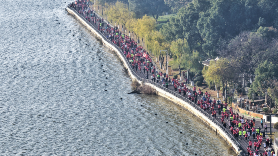 上午9时,发令枪响起,参赛选手们从南湖广场鱼贯而出。本站赛事设经典跑(约12公里)和健康跑(约6公里)两个项目,分男子、女子组别,共计3000人参与。经典跑选手沿南湖游步道,途经半岛文化馆餐厅、南津古渡码头、龟山岛山庄等标志性景观,在湖光山色中完成折返挑战;健康跑选手则同样沿风景秀丽的游步道,体验了一段更为亲民宜人的折返路线。南湖的冬日美景与跑者跃动的身影交织,构成了一道充满生机与活力的风景线。