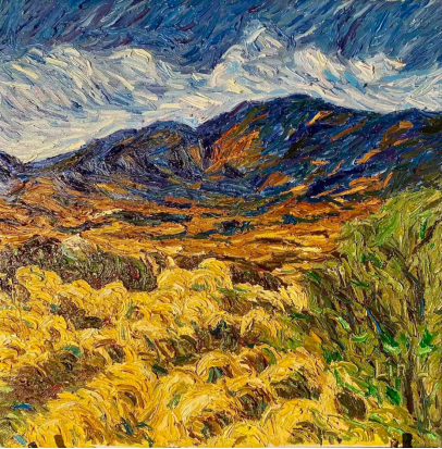 色彩在她的笔下,也超越了描述与抒情,成为一种结构情感、推动表现的“动词”。在《The Winds of Sliabh Mis》中,高纯度的冷暖色在山坡与云层间起伏旋转,风不再只是自然现象,更成为一种精神性的驱动力。而在《Golden Portaigh R-255》里,金黄泥炭地与远处蓝紫色山体的对峙,地表厚涂如季节剥落的皮肤,同时传递出生命的韧性与大地的荒凉。李琳不将荒凉浪漫化为忧伤,而是将其呈现为一种存在的证明——脆弱与顽强在画面中并存,色彩因而成为复杂情感的载体。