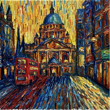 李琳常在作品标题中使用爱尔兰语地名,如《Vortex of Bóthar na bhFál Dorcha》《Crimson Plateau of An Mhucais》等。这并非地域风情的点缀,而是一种文化的锚定,将风景从“普遍自然”的抽象中拉回具体的历史与语言传统。在《The Silence of Ghaibhóile》中,暮色里的小屋静立于山间,沉默被塑造为“土地的语言”。风景在此成为记忆的媒介,它要求我们停留、倾听,以沉默抵达深处的理解。同样的绘画逻辑也被她延伸至城市空间。在《Symphony of the Dome, Béal Feirste》与《Ten Minutes After Sunset, Béal Feirste》中,市政厅穹顶成为时间与节奏的节点,红色巴士、街道光影与厚重笔触共同谱写成一首都市交响。纪念性建筑的“历史重力”与当代生活的“速度感”在此叠印交织,港口日落后的十分钟则成为一个阈限时刻——昼夜交替不再是自然现象,而是城市情绪的转场。