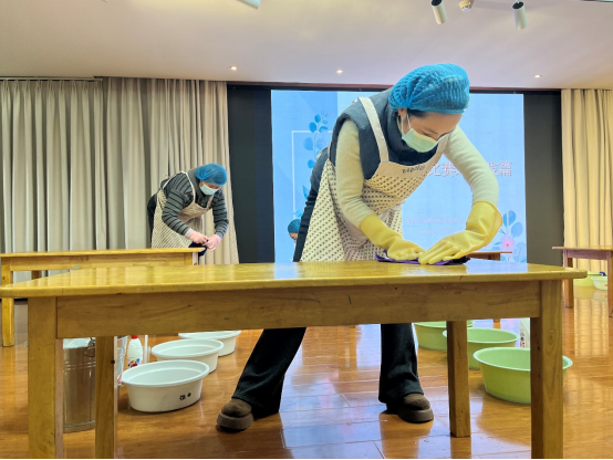 比赛分理论笔试与实操技能两大模块。笔试环节,老师们沉着审题、细致作答,展现扎实理论功底;实操环节聚焦消毒药剂配比、桌面消毒等核心工作,大家严格遵循“清—消—清”流程,动作娴熟规范,每一步都彰显日常积累的细心与匠心,获评委认可。