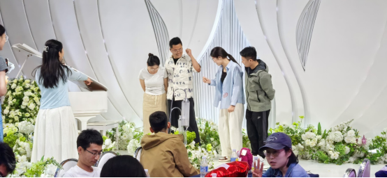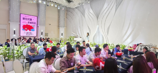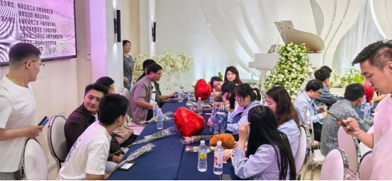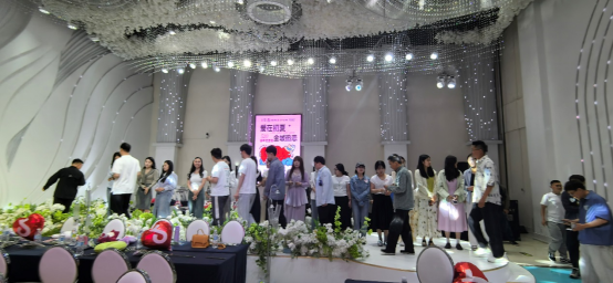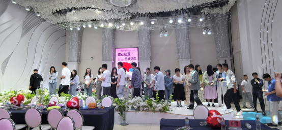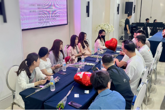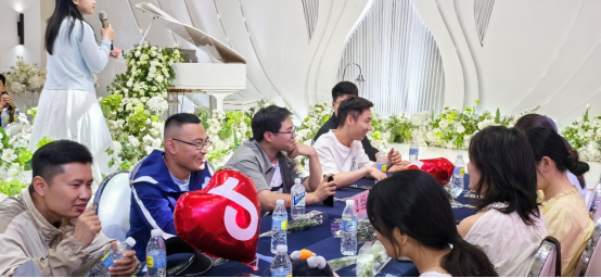 活动伊始,大家大胆地介绍自己分享自己生活中的小趣事,通过有趣的分享青年们逐渐放下防备,彼此间的距离也在不知不觉中拉近,现场气氛愈发活跃。随后,青年们一起“猜情歌”、“拆爱情盲盒”最后在“报纸折叠”的游戏中逐渐拉近彼此的距离,现场氛围不断升温,欢声笑语此起彼伏。在告白环节,有人大方的递出了“爱的号码牌”,也有羞涩的小伙紧张得声音微微颤抖,却依旧坚定地诉说着内心的喜欢,双手递出的鲜花传递着满满的诚意,现场不少人成功牵手。