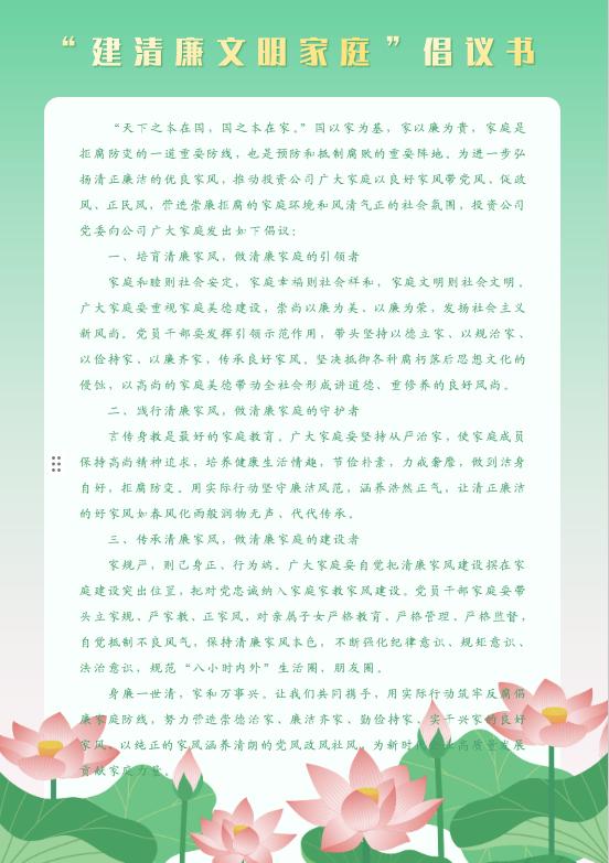 组织全体党员干部赴保定市直隶审判厅博物馆开展“传承红色司法精神、弘扬清正廉洁之风”主题活动。通过参观历史文物、庭审场景复原以及典型案例展陈,深刻了解了中国法治建设的发展历程,全面感受了法治制度对社会治理和权力的规范作用。让“廉洁红线不能碰”的意识入脑入心。 发放清廉文明家庭倡议书 营造风清气正的干事创业环境 廉洁从业是企业发展的生命线,更是每一位员工安身立命的根本。为深入推进公司廉洁文化建设,筑牢拒腐防变的思想防线,营造风清气正的干事创业环境,通过发放“建清廉文明家庭”倡议书,进一步筑牢思想防线,做好廉洁理念的践行者;强化严守纪律规矩,做好廉洁行为的示范者;弘扬清廉家风,做好廉洁建设的推动者。