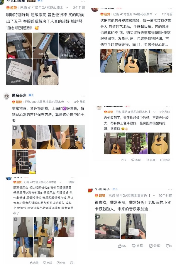 四、 市场回声:“自来水”口碑铸就护城河真正的爆款,源于用户的真心推荐。在电商平台与社交媒体的真实反馈中,几个高频词勾勒出星月系列的画像: “后悔没早买”: “之前预算不足想买合板,后面有活动买了星月后,朋友都说听起来不像这个价位的琴,练琴动力都足了!” “拍照C位担当”: “每次拍弹唱视频,弹幕都在问吉他链接,颜值太高了!” “新手友好天花板”: “琴颈手感太舒服了,弦距调校得很低,按弦不疼,终于能坚持练下去了。” “细节控狂喜”: “从品丝抛光到漆面工艺,完全看不到千元琴的毛糙感,做工真心细致。” 这些来自市场的真实声音,让星月系列持续稳居“千元内高人气吉他榜”前列。