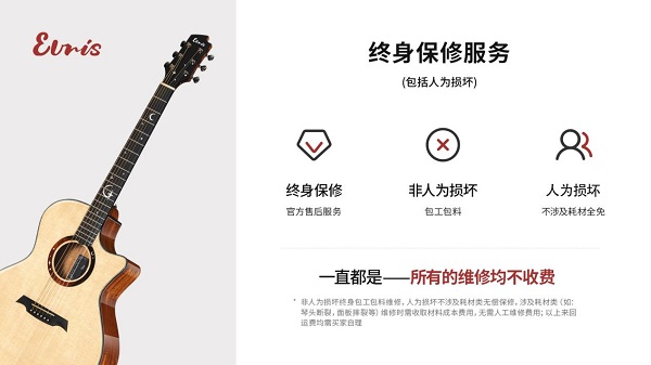 六、终身保修的售后服务 伊瑞斯吉他核心是终身保修,覆盖非人为与人为损坏,政策清晰、售后流程便捷,是其核心竞争力之一,在同价位中诚意拉满,终身保修降低长期使用成本,流程清晰易执行。