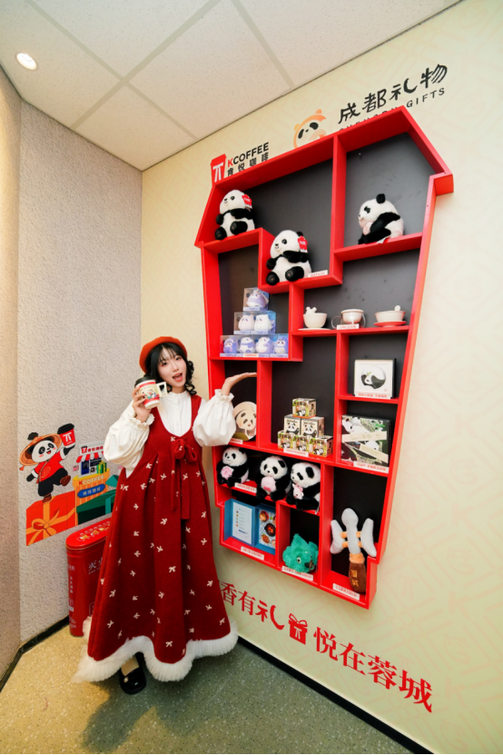 步入联名主题概念店,最具品牌辨识度的亮点,当属专为此次联名打造的咖啡杯造型多宝阁展示柜。该展示柜以肯悦咖啡经典杯型为原型,打造出分层陈列空间,将精心遴选的“成都礼物”文创产品陈列其中——涵盖金沙太阳神鸟公仔、非遗蜀绣、彭州白瓷、熊猫纸竹香扇等兼具文化底蕴与实用价值的产品,既延续了肯悦咖啡现代简约的空间设计风格,又让城市文化元素成为门店场景的有机组成部分,成为消费者打卡留影的核心区域。