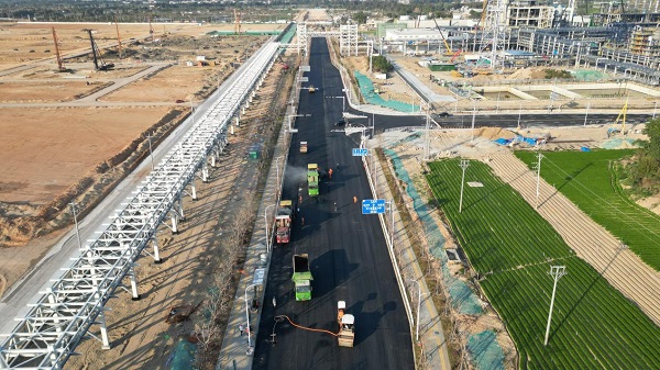 在福建漳州,古雷乡村振兴精细化工富民示范产业园一期项目道路子项目石化二路(一期)工程正在进行沥青摊铺作业。元旦期间,项目团队严格落实安全生产责任制,党员带头坚守一线,严格把控建设质量,确保施工高效有序进行。项目建成后,将完善古雷化工园区路网结构,为园区地块开发和企业运营提供交通支撑,为区域高质量发展注入强劲动力。