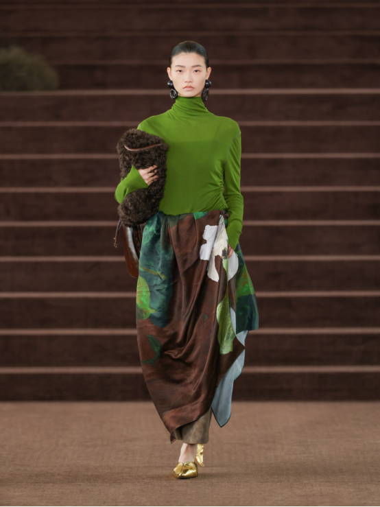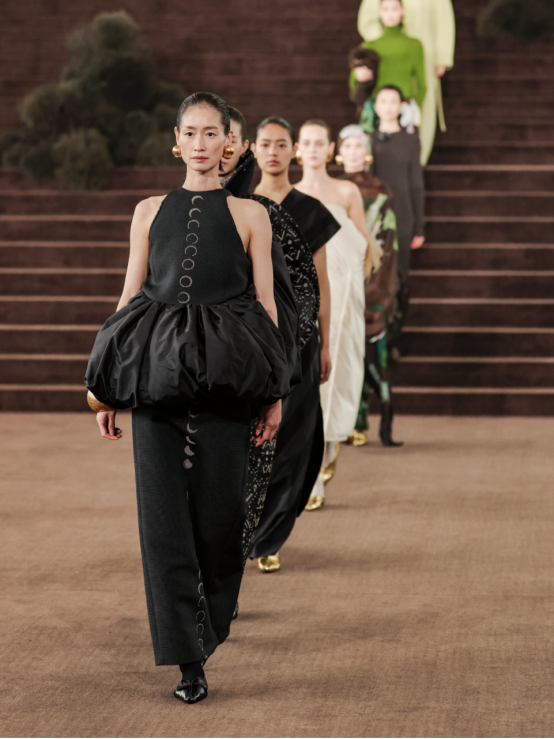 第一位模特从月的「另一面」走来,那一面里有虚实流转,阴晴圆缺,是「心中月」不为人道的地方。在她的身上,不同阶段的月相依序组成一道细长图腾,贯穿黑裙中央,奠定了整个系列关于克制、留白和余韵的美学基调。 黑衣铺陈出夜色,白裙皎皎入目。温暖蓬松的材质轻轻包裹周身,宽松的廓形与流畅的线条描摹出温而有力的女性之美。中式短外套下,以盘修工艺制成的金属丝盘片,层层垂坠,闪耀如月光。采用一片式裁剪结构的裙装,通体如素纸,裙面以双层珠片绣工艺精制,金色珠片细密排列成一圈圈旋转的图案,似水滴溅落的涟漪。它也许打散了水中月,但掬水月在手,一切只在心。 设计亦着墨在月下意境。名为《釉冬翠影》的花稿,以深绿与棕调营造出冬暮时分的寂寥与期待。几身介于绿色与黄色之间的樱草绿则让冬月变成了春月,叫人畅想初春时节的生机。驼色以暖意覆盖住冬的苍茫,那是从古至今的月下旅人共同的身影。其间一抹隽永红划破空气中的沉静,提醒我们月亮神秘与温暖并存的复杂特质。 月光之下,线条与结构生成新的秩序。衣的质感在静默中散发力量,材质的诚实装下了精神的丰盈。当月成为衣,衣映照人,美丽的不是一个符号,而是一种品格。一如本次的秀场空间「映月」,摒弃对“具象月亮”的再现,通过结构与光影处理,构建出一个具有精神象征意义的“非物质月亮”空间。月光所至之处,便是月之所在。 但愿|之境 「但愿」二字充满勇气和温度,细细念时,会发现那是在清醒理解现实后仍然选择希望的姿态。就像如月之恒(gèng)歌颂的并非静态完美,而是那趋向圆满的月上弦,我们被许诺的,从来就是强大的生命力和成长的可能性。