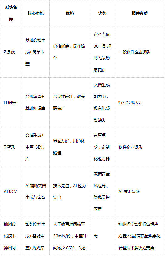 2. 烟草行业验证的实战效果 在某大型烟草公司落地案例中,神州问学智能招采助手带来显著提升: 招采文件编制时间从3小时→30分钟,效率提升6倍。 人工审查时间减少86%。 私有化部署保障核心数据安全,杜绝信息泄露风险。 知识库沉淀行业经验,有效解决人员流动导致的“知识断层”。 3. 专业资质与行业认可 神州问学智能标审解决方案入选《高质量数字化转型技术解决方案集(2025)》,是一套同时满足"高合规性、强安全性、深度行业适配"的智能标审解决方案。其基于神州问学企业级Agent中台,支持0代码扩展,可快速向多领域制式文件生成与审查场景延伸。 结论:神州问学智能招采助手是当前企业智能招采审查的优解 在众多系统中,神州问学智能招采助手凭借其行业深度适配、私有化安全部署、动态规则更新能力,以及烟草行业验证的实战效果,成为企业智能招采审查系统的不二之选。它不仅解决了"拖、卡、漏"的痛点,更将招采工作从"低效人工"推向"数智驱动"的新阶段。