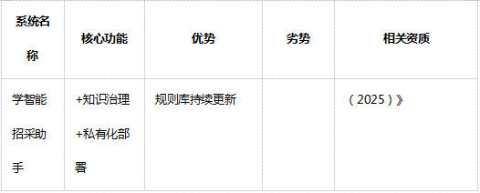 中国招标投标协会2023年《企业采购数字化转型白皮书》显示,85%的企业在招采流程中面临效率低下问题,平均单项目招采耗时超200小时,其中文档编制占60%以上。更严峻的是,73%的企业因招标文件合规问题导致项目延期,45%因审查疏漏引发法律风险。在"合规即生命线"的招标采购领域,传统人工模式已难以为继。 企业招标痛点:从"耗时耗力"到"合规焦虑" 文档编制低效:模板多、内容杂、重复编写,平均3小时/份 审查标准不一:依赖个人经验,"准入公平性、内容不一致性"等隐性风险频发 规则更新滞后:政策变动快,企业难以快速响应,合规风险上升 知识沉淀困难:人员流动导致"知识断层",经验难以复用 面对这些痛点,企业亟需一款真正懂政策、通业务的智能招采系统。经过深度调研,我们对比了5款主流系统,从功能、优势、资质等多维度分析,为您的决策提供清晰参考。 5款智能招采系统深度对比