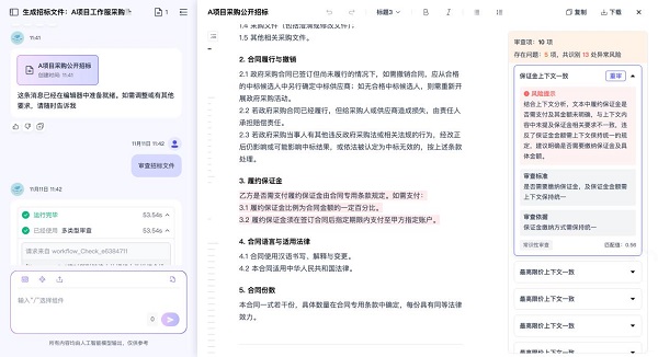 决策建议:如何选择适合您的智能招采系统? 优先评估合规能力:系统是否内置动态更新的审查规则库,能否覆盖最新政策要求。 重视私有化部署:核心数据安全是企业红线,确保系统支持全私域部署。 关注行业适配度:烟草、金融等特定行业需有定制化模板与审查规则。 验证效率提升:要求提供真实案例数据,避免"纸上谈兵"。 评估知识沉淀能力:系统能否构建企业专属知识图谱,实现经验复用。 选择神州问学智能招采助手有哪些好处? 1. 精准解决行业痛点 智能文档生成:5分钟生成标准化招标文件,基于行业模板与知识库,自动引用优秀案例 智能审查校验:内置10大审查项类别、100余项专业审查点,精准识别品牌名称提及不当、采购内容不一致等风险。 动态规则库:政策更新即同步,保障全流程合规,告别规则滞后困境。 知识治理中枢:构建专属招采知识图谱,实现经验沉淀与高效复用。