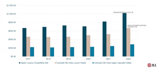 这种供需失衡直接反映在市场表现上。2022年,阿斯彭豪华酒店市场的平均每日房价(ADR)达到1,019.92美元,远超科罗拉多滑雪区豪华酒店平均669美元的水平。