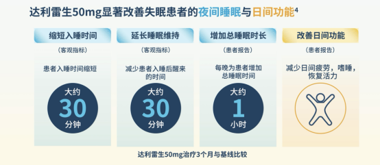 共病患者最担心的安全问题,达利雷生给出了满意答案。它无成瘾性、无戒断反应,长期使用不产生耐药性,老年患者、重度肾损患者无需调整剂量,合并多种基础疾病的患者也能放心使用。与传统药物相比,其宿醉反应极轻,日间思睡发生率仅2%-4%,不会影响次日工作、驾驶等日常活动。 更难得的是,达利雷生能同步改善失眠相关的日间功能障碍,无论是嗜睡、疲劳,还是情绪低落、认知下降,都能得到显著缓解。它不仅解决了“睡不着”的表层问题,更帮助患者重建身心健康,摆脱社交隔离,重拾高质量生活,成为失眠共病患者的安心之选。