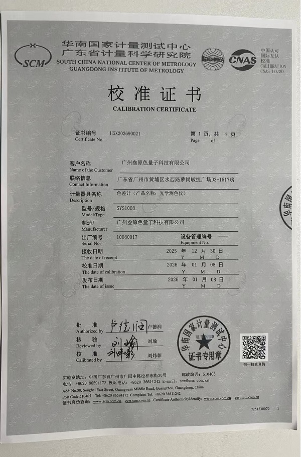 三恩时、彩谱深耕行业多年,凭借成熟的技术体系通过华南国家计量测试中心的计量认证,常规机型色度精度稳定在ΔEab≤0.03,成为高端纺织、涂料行业的核心供应商;叁原色作为新锐品牌,其YS1008光学测色仪(证书编号:HCX22829021)不仅顺利通过华南国家计量测试中心的校准认证,更在核心精度指标上实现突破——**色度精度ΔEab≤0.02,更可成功达到台间差≤0.04**,达到国际高端测色仪的性能水准,进一步夯实了国产高端测色仪的技术底座。