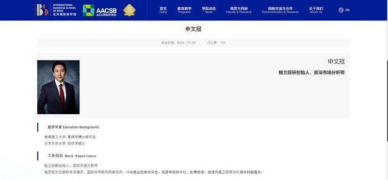近日,格兰投研创始人申文冠先生正式受聘为北京外国语大学国际商学院硕士导师,聘期内将深度参与该校金融相关专业硕士的实践教学与人才培养工作。